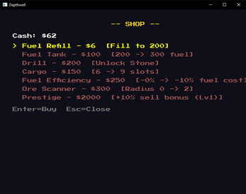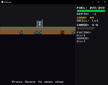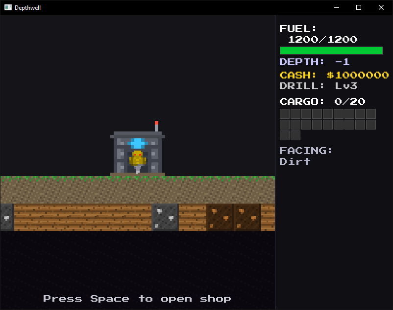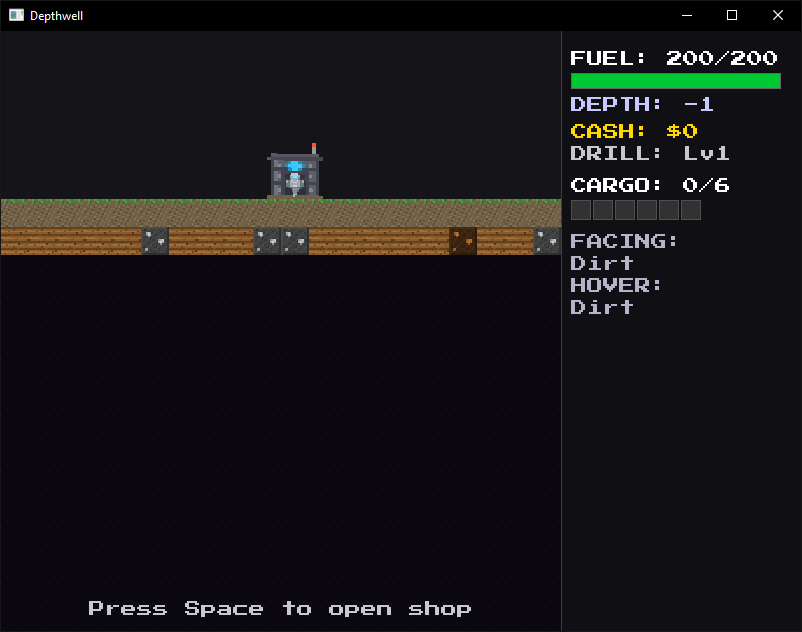 You're a mining robot drilling through layers of earth. Every block you break and every step you take costs fuel. Collect ores, haul them back to the shop on the surface to sell them, buy upgrades, go deeper.